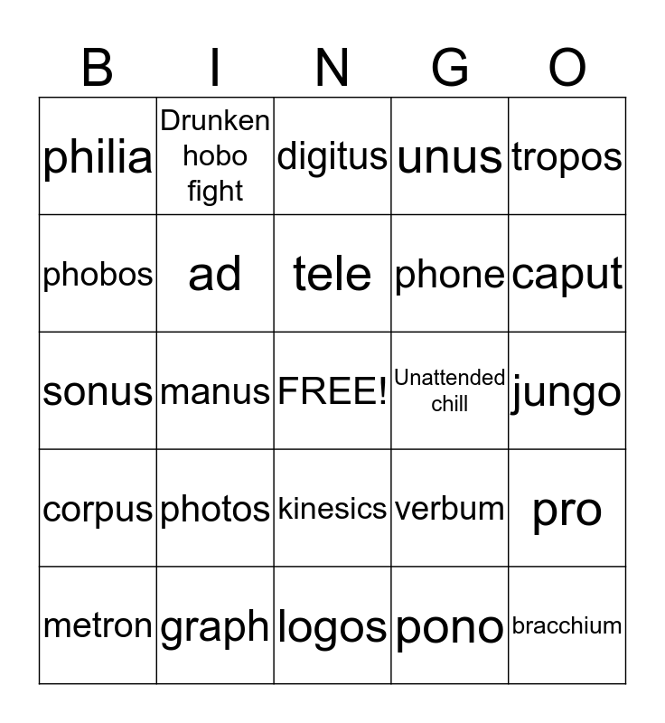 This bingo card has a free space and 24 words: photos, graph, tele, metron, tropos, philia, phobos, Drunken hobo fight, Unattended chill, kinesics, phone, sonus, verbum, pro, ad, pono, jungo, digitus, caput, manus, bracchium, corpus, unus and logos.
