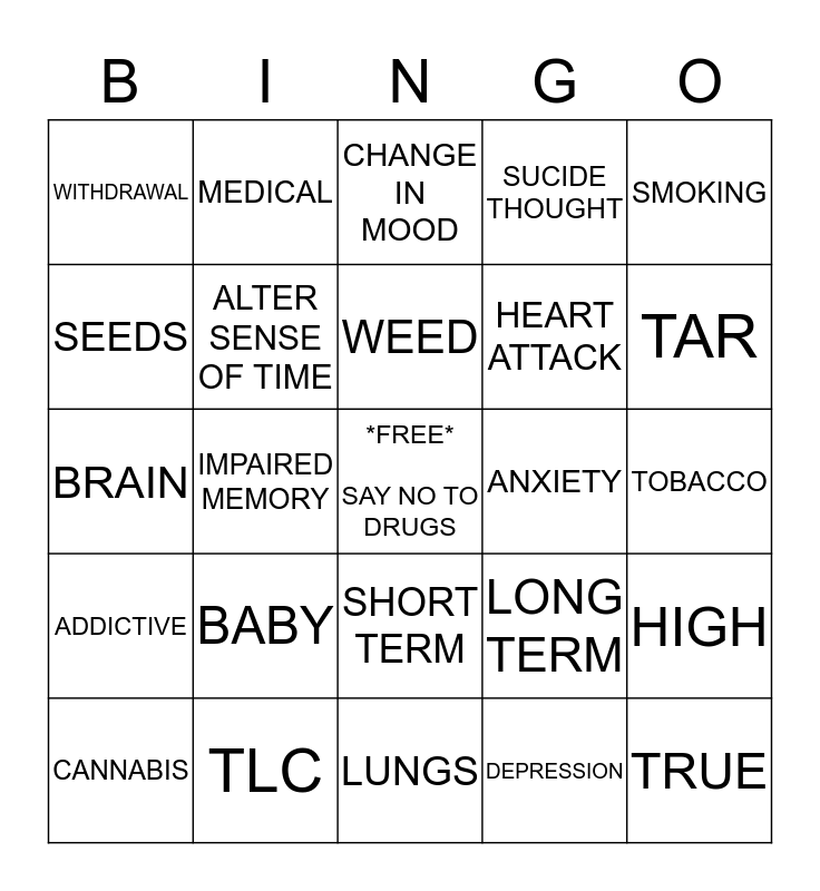 This bingo card has a free space and 24 words: BABY, TLC, WEED, CANNABIS, SMOKING, WITHDRAWAL, SEEDS, MEDICAL, ANXIETY, SHORT TERM, HEART ATTACK, BRAIN, LONG TERM, HIGH, ALTER SENSE OF TIME, DEPRESSION, TOBACCO, CHANGE IN MOOD, TAR, IMPAIRED MEMORY, TRUE, ADDICTIVE, SUCIDE THOUGHT and LUNGS.