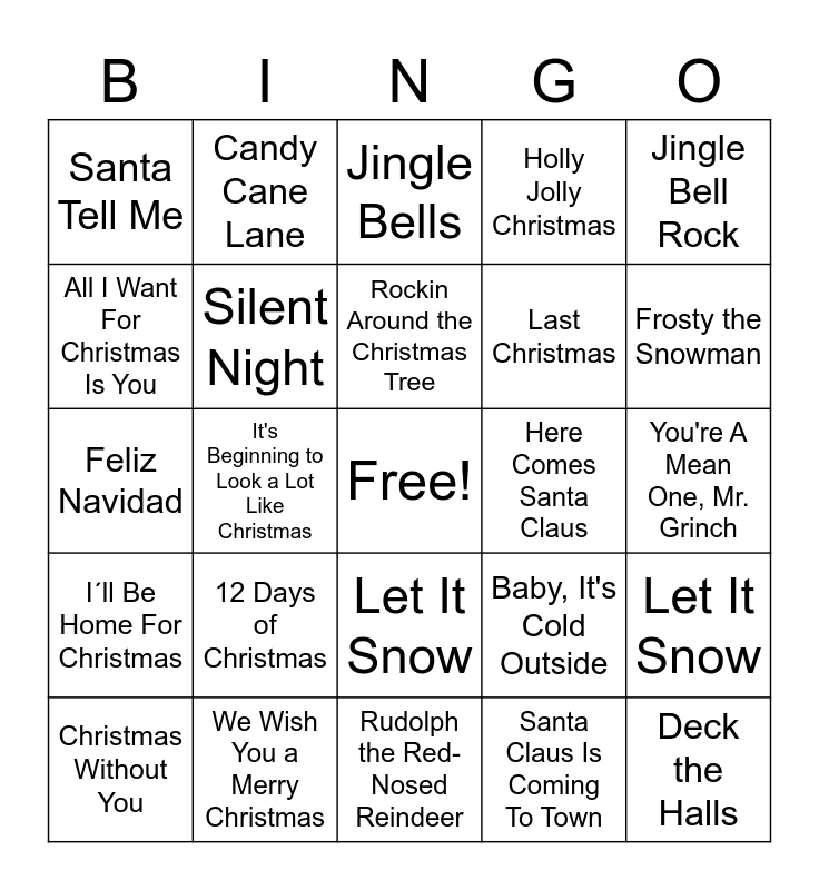 This bingo card has a free space and 24 words: 12 Days of Christmas, We Wish You a Merry Christmas, Rockin Around the Christmas Tree, Christmas Without You, Jingle Bell Rock, Santa Tell Me, All I Want For Christmas Is You, Candy Cane Lane, Here Comes Santa Claus, Let It Snow, Last Christmas, Feliz Navidad, Baby, It's Cold Outside, Let It Snow, Silent Night, Santa Claus Is Coming To Town, You're A Mean One, Mr. Grinch, Jingle Bells, Frosty the Snowman, It's Beginning to Look a Lot Like Christmas, Deck the Halls, I´ll Be Home For Christmas, Holly Jolly Christmas and Rudolph the Red-Nosed Reindeer.