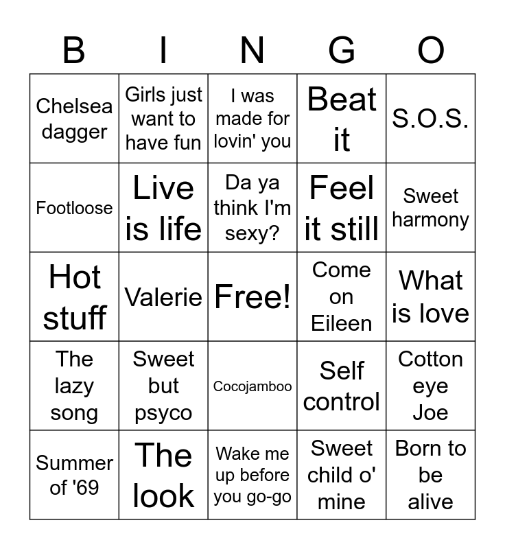 This bingo card has a free space and 30 words: The look, Atomic, Valerie, I love to love, Chelsea dagger, I was made for lovin' you, Live is life, Cocojamboo, Come on Eileen, Wake me up before you go-go, What is love, Born to be alive, Sweet child o' mine, Smalltown boy, Sweet harmony, In the shadows, Self control, The lazy song, Sweet but psyco, S.O.S., Hot stuff, Wannabe, Girls just want to have fun, Feel it still, Footloose, Beat it, Cotton eye Joe, Summer of '69, Da ya think I'm sexy? and Crazy little thing called love.