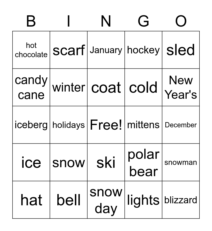 This bingo card has a free space and 24 words: snow, bell, coat, hat, sled, hot chocolate, candy cane, scarf, mittens, ski, cold, iceberg, polar bear, snowman, winter, lights, December, January, New Year's, holidays, blizzard, ice, hockey and snow day.