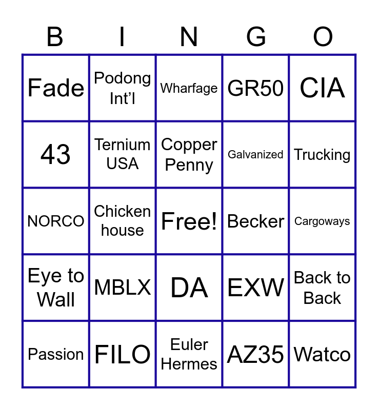 This bingo card has a free space and 35 words: Ports America, Woodhouse, Precoat, Ternium USA, DA, GR50, 43, 26GA, Copper Penny, Galvatec, NORCO, CIA, Lem Verbena v2122E, Imperial Eagle v2182E, Fade, Becker, AZ35, Chicken house, Eye to Wall, Watco, EXW, Passion, Back to Back, FILO, Wharfage, Trucking, Curtis, Ghost Mart, Galvanized, Cargoways, Top 1.0mil/Back 0.5mil, Euler Hermes, MBLX, Podong Int’l and Weight/Length.