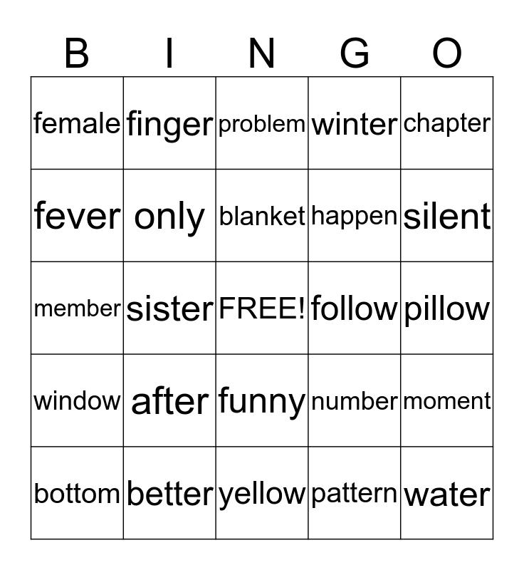 This bingo card has a free space and 24 words: after, better, blanket, bottom, chapter, female, fever, finger, follow, funny, happen, member, number, moment, only, pattern, pillow, problem, silent, sister, water, window, winter and yellow.