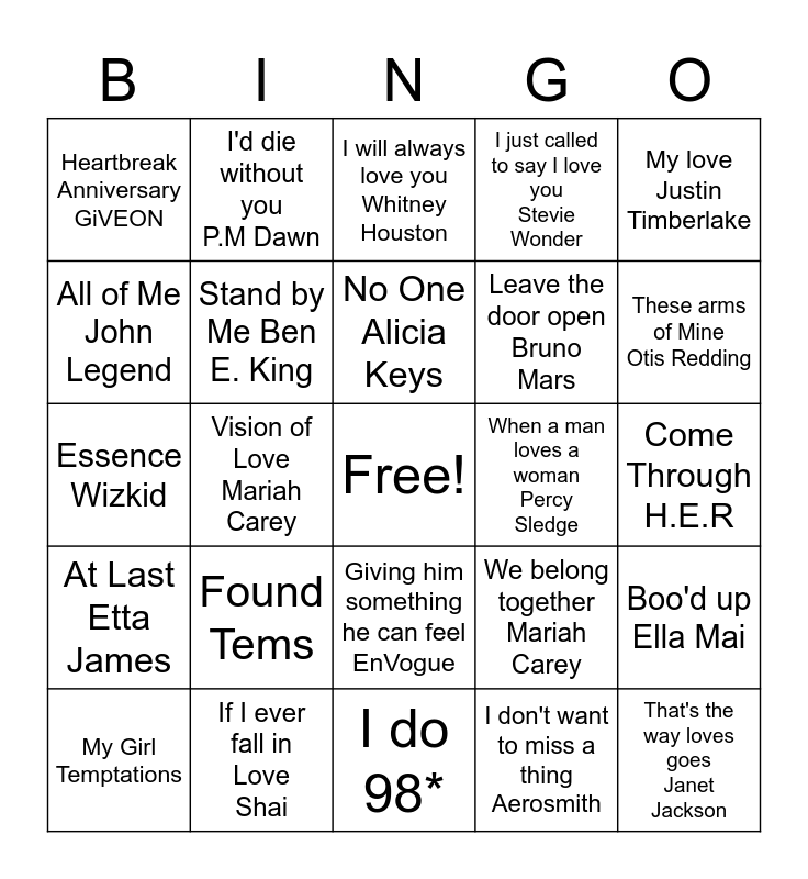 This bingo card has a free space and 29 words: My Girl Temptations, You make me wanna Usher, Vision of Love Mariah Carey, No Ordinary Love Sade, Heartbreak Anniversary GiVEON, I will always love you Whitney Houston, Stand by Me Ben E. King, Found Tems, When a man loves a woman Percy Sledge, If I ever fall in Love Shai, Come Through H.E.R, That's the way loves goes Janet Jackson, I do 98*, I don't want to miss a thing Aerosmith, These arms of Mine Otis Redding, A moment like this Kelly Clarkson, Giving him something he can feel EnVogue, At Last Etta James, My love Justin Timberlake, Essence Wizkid, We belong together Mariah Carey, Not another love song Ella Mae, Leave the door open Bruno Mars, All of Me John Legend, I just called to say I love you Stevie Wonder, I'd die without you P.M Dawn, Boo'd up Ella Mai, No One Alicia Keys and Sweet love Anita Baker.