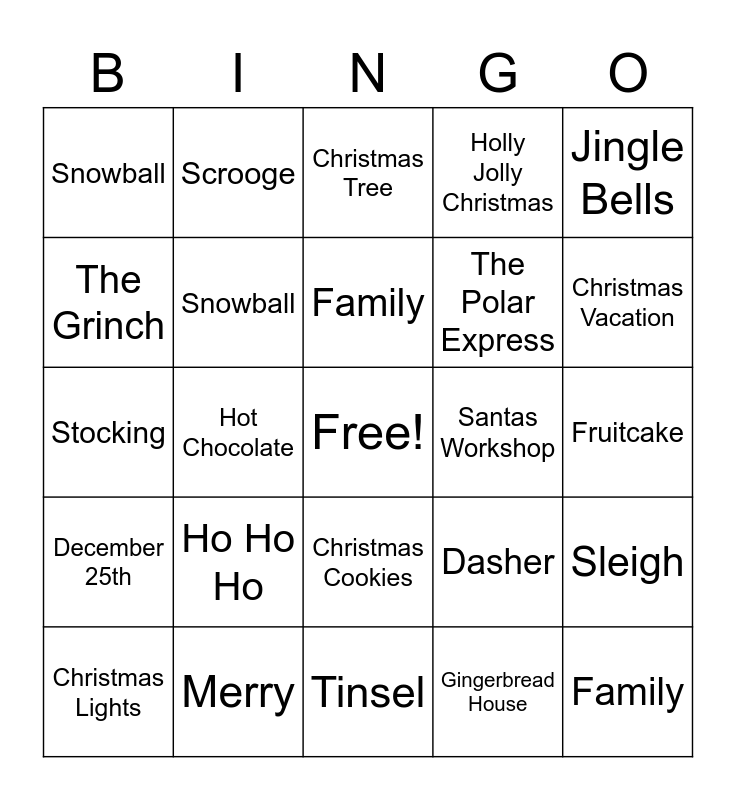 This bingo card has a free space and 24 words: Ho Ho Ho, Merry, Family, Christmas Lights, Jingle Bells, Snowball, The Grinch, Scrooge, Santas Workshop, Christmas Cookies, The Polar Express, Stocking, Dasher, Sleigh, Snowball, Gingerbread House, Fruitcake, Christmas Tree, Christmas Vacation, Hot Chocolate, Family, December 25th, Holly Jolly Christmas and Tinsel.