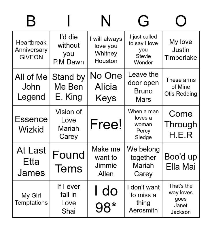 This bingo card has a free space and 29 words: My Girl Temptations, You make me wanna Usher, Vision of Love Mariah Carey, No Ordinary Love Sade, Heartbreak Anniversary GiVEON, I will always love you Whitney Houston, Stand by Me Ben E. King, Found Tems, When a man loves a woman Percy Sledge, If I ever fall in Love Shai, Come Through H.E.R, That's the way loves goes Janet Jackson, I do 98*, I don't want to miss a thing Aerosmith, These arms of Mine Otis Redding, A moment like this Kelly Clarkson, Make me want to Jimmie Allen, At Last Etta James, My love Justin Timberlake, Essence Wizkid, We belong together Mariah Carey, Not another love song Ella Mae, Leave the door open Bruno Mars, All of Me John Legend, I just called to say I love you Stevie Wonder, I'd die without you P.M Dawn, Boo'd up Ella Mai, No One Alicia Keys and Sweet love Anita Baker.