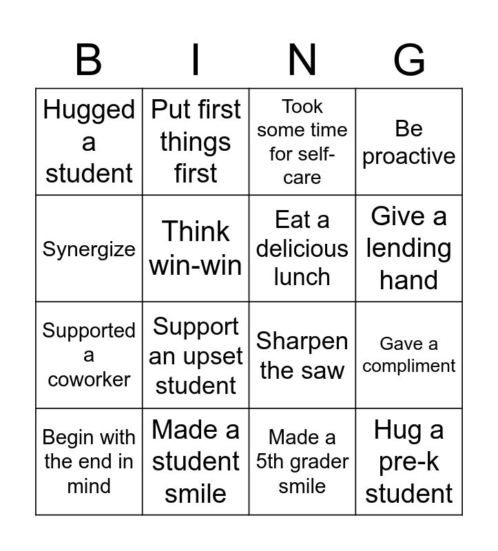 This bingo card has 16 words: Made a student smile, Gave a compliment, Took some time for self-care, Hugged a student, Supported a coworker, Put first things first, Sharpen the saw, Made a 5th grader smile, Synergize, Think win-win, Begin with the end in mind, Be proactive, Support an upset student, Give a lending hand, Eat a delicious lunch and Hug a pre-k student.