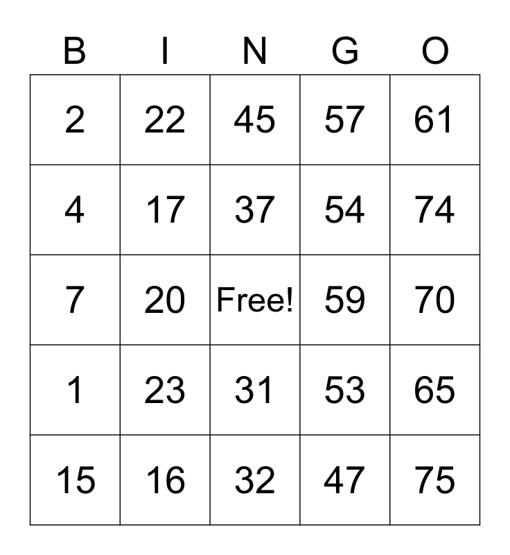 This bingo card has a free space and 24 words: 15, 23, 37, 47, 61, 2, 22, 45, 59, 70, 7, 17, 53, 65, 4, 16, 32, 57, 74, 1, 20, 31, 54 and 75.
