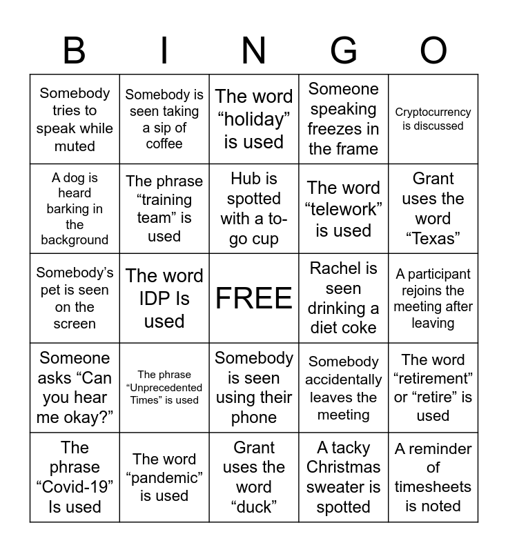 This bingo card has a free space and 24 words: The phrase “Unprecedented Times” is used, The word “pandemic” is used, Hub is spotted with a to-go cup, The phrase “Covid-19” Is used, Cryptocurrency is discussed, Somebody tries to speak while muted, A dog is heard barking in the background, Somebody is seen taking a sip of coffee, Rachel is seen drinking a diet coke, Somebody is seen using their phone, The word “telework” is used, Somebody’s pet is seen on the screen, Somebody accidentally leaves the meeting, The word “retirement” or “retire” is used, The phrase “training team” is used, A tacky Christmas sweater is spotted, A participant rejoins the meeting after leaving, The word “holiday” is used, Grant uses the word “Texas”, The word IDP Is used, A reminder of timesheets is noted, Someone asks “Can you hear me okay?”, Someone speaking freezes in the frame and Grant uses the word “duck”.