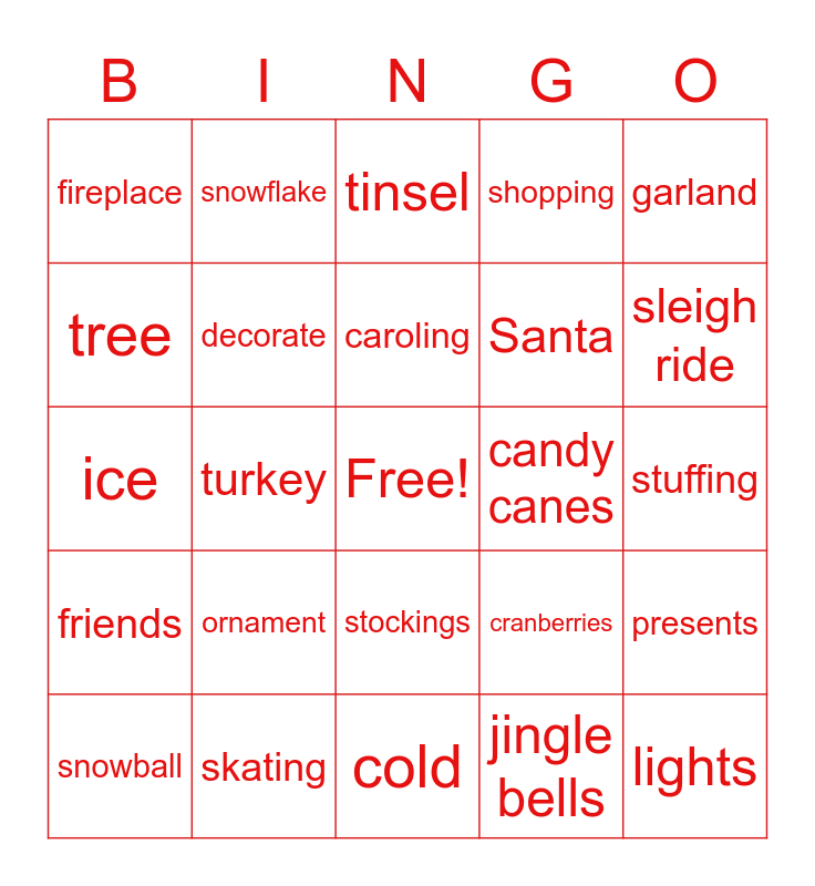 This bingo card has a free space and 28 words: presents, toys, Santa, jingle bells, tree, tinsel, snowflake, friends, candy canes, snowball, ice, shopping, skating, cold, sleigh ride, festive, ornament, decorate, caroling, stockings, fireplace, eggnog, lights, turkey, stuffing, cranberries, garland and wrapping.