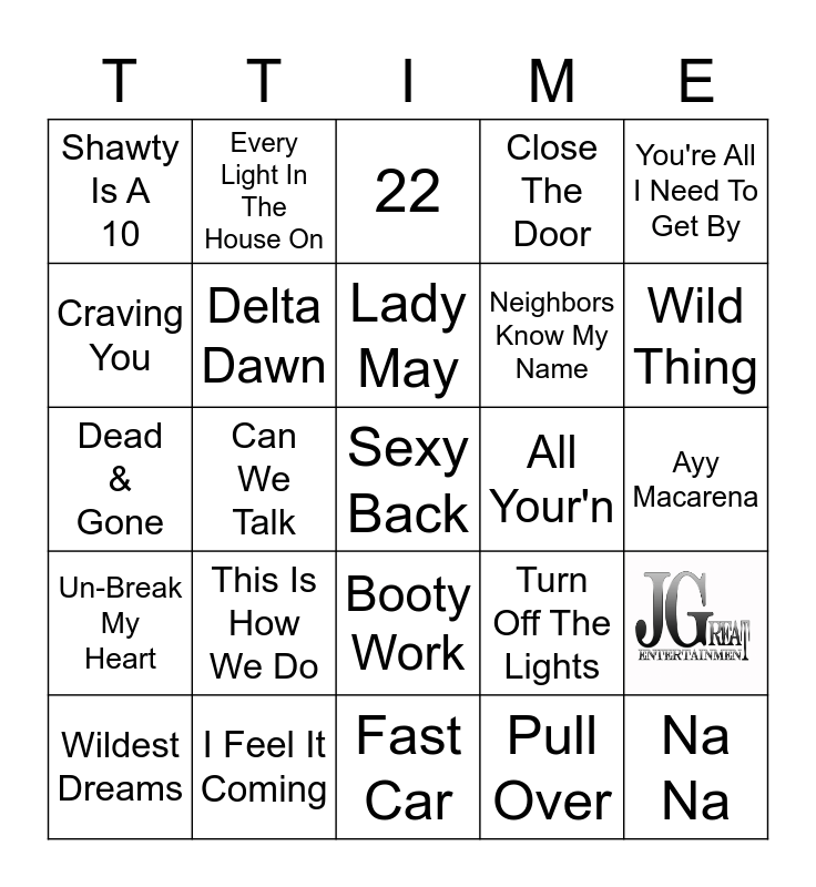 This bingo card has 1 images and 50 words: Promiscuous Girl, Sexy Back, Ice Box, Fast Car, This Is How We Do, Honkytonk Badonkadonk, Every Light In The House On, Beer With Jesus, Craving You, Stand By Your Man, Delta Dawn, Close The Door, Turn Off The Lights, Should Have Been A Cowboy, Feathered Indians, Lady May, All Your'n, Or Nah, You're All I Need To Get By, Can We Talk, Pull Over, Shawty Is A 10, Neighbors Know My Name, Can't Help ButA Wait, Na Na, Wild Thing, Overnight Celebrity, Wildest Dreams, 22, We Are Never Getting Back Together, You Belong With Me, How Do U want It, California Love, Star Boy, I Feel It Coming, It's Not Unusual, The Best, What's Love Got To Do With It, Free Fallin, Ayy Macarena, Un-Break My Heart, Breathe Again, Over And Over, Indian Outlaw, Lately, Dead & Gone, Whatever You Like, Bring Em Out, Booty Work and Luv.
