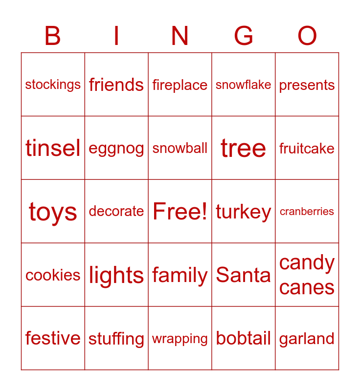 This bingo card has a free space and 29 words: festive, ornament, decorate, caroling, stockings, fireplace, eggnog, lights, turkey, stuffing, cranberries, garland, wrapping, bobtail, fruitcake, movies, family, cookies, presents, toys, Santa, jingle bells, tree, tinsel, snowflake, friends, candy canes, snowball and ice.