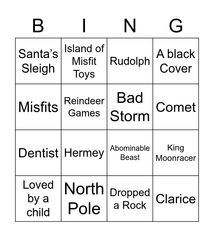 This bingo card has 22 words: North Pole, Smallest, Island of Misfit Toys, Red, Reindeer Games, Bad Storm, Santa’s Sleigh, Rudolph, Abominable Beast, Clarice, Dentist, A black Cover, Silver & Gold, Yukon Cornelius, Dropped a Rock, Pulled teeth out, King Moonracer, Loved by a child, Hermey, Misfits, Comet and A Doll.