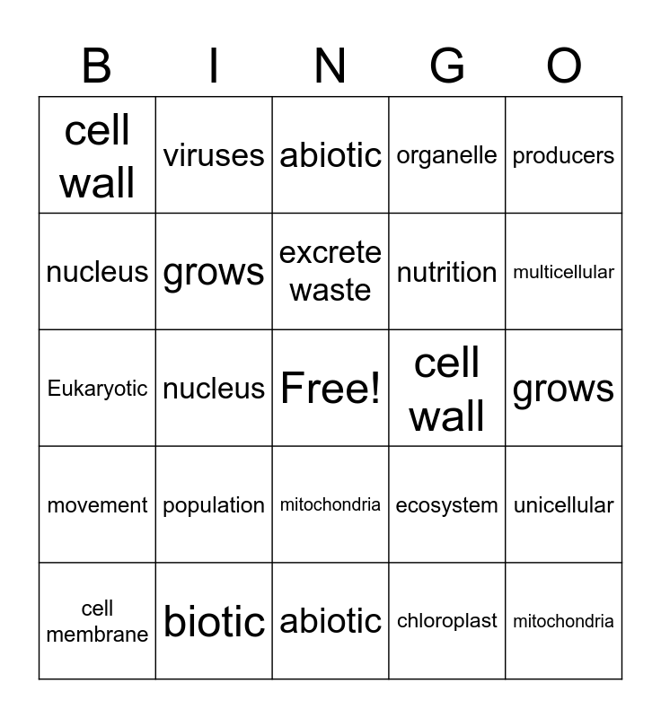 This bingo card has a free space and 30 words: biotic, consumers, nucleus, organelle, cell wall, abiotic, grows, mitochondria, cell wall, abiotic, grows, mitochondria, chloroplast, cells, multicellular, abiotic, ecosystem, movement, population, producers, Eukaryotic, Prokaryotic, viruses, nutrition, nucleus, organelle, unicellular, cell membrane, excrete waste and microscope.