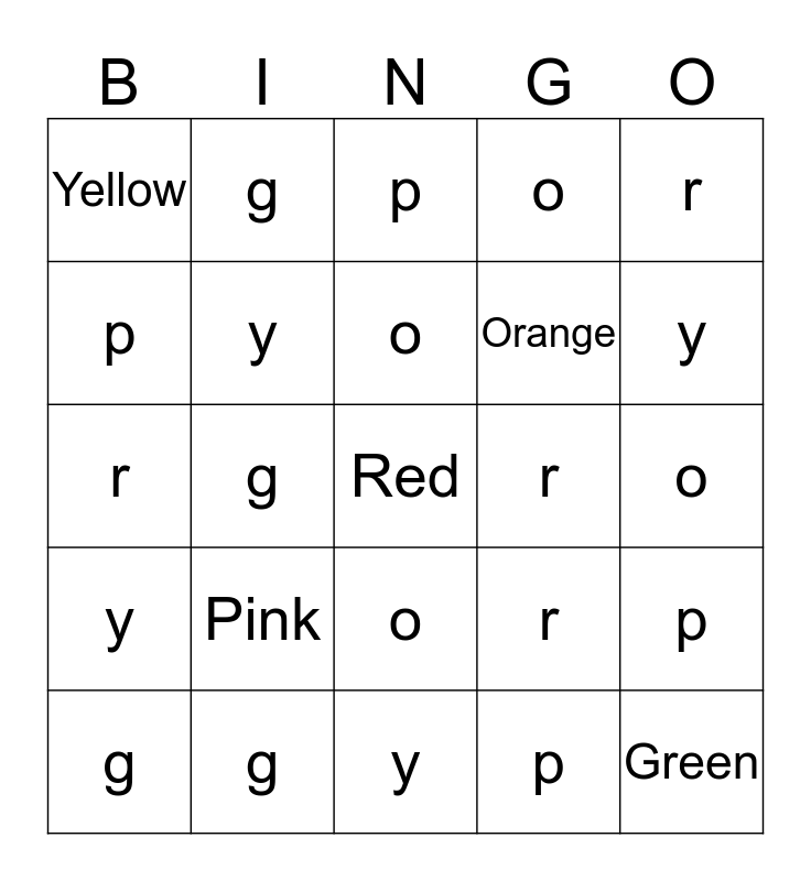 This bingo card has 25 words: Pink, y, o, g, r, Yellow, p, g, r, o, Orange, r, r, p, y, Green, o, p, y, g, Red, g, y, o and p.
