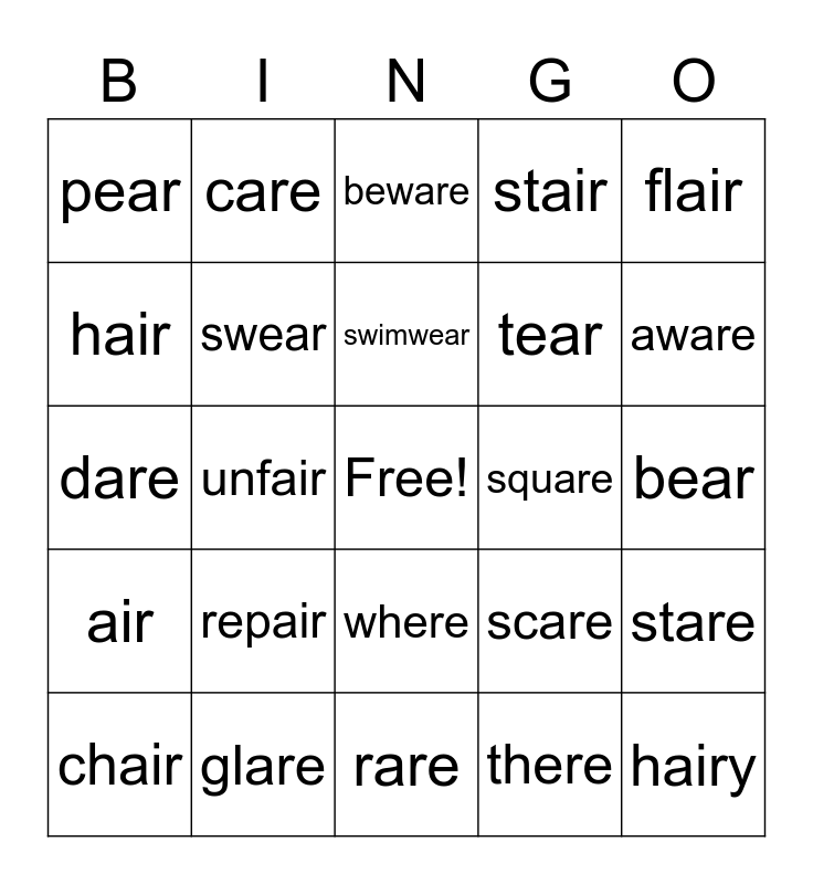 This bingo card has a free space and 24 words: repair, glare, swimwear, chair, flair, pear, hair, care, square, where, tear, dare, scare, stare, swear, there, bear, beware, aware, unfair, hairy, air, stair and rare.