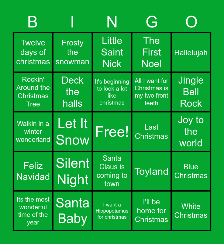 This bingo card has a free space and 39 words: Your a mean one, Mr.Grinch, Have yourself a merry little christmas, All I want for christmas is you, Deck the halls, Its the most wonderful time of the year, Santa Claus is coming to town, It's beginning to look a lot like christmas, Dreidel, Dreidel, Dreidel, Hallelujah, Feliz Navidad, Let It Snow, The First Noel, White Christmas, Joy to the world, Last Christmas, Silent Night, Holly Jolly Christmas, Twelve days of christmas, Up on the housetop, Toyland, Rockin' Around the Christmas Tree, I want a Hippopotamus for christmas, All I want for Christmas is my two front teeth, Jingle Bell Rock, Jingle Bells, Grandma Got Run Over by a Reindeer, Do you hear what I hear?, Where are you Christmas?, Rudolph the red-nosed reindeer, Frosty the snowman, Wonderful Christmas Time, I saw mommy kissing Santa Claus, Little Saint Nick, Santa Baby, I'll be home for Christmas, The Christmas Song (chesnuts roasting on an open fire), Blue Christmas, Walkin in a winter wonderland and Here comes Santa Claus.