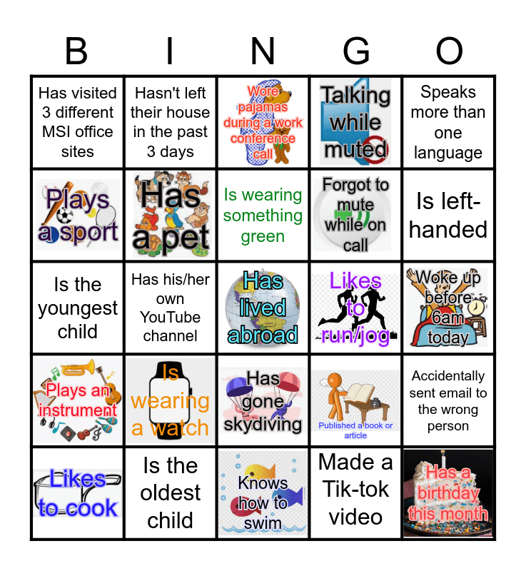 This bingo card has 18 images and 33 words: Has a birthday this month, Has worked at MSI for 5+ years, Has his/her own YouTube channel, Doesn't drink coffee, Plays an instrument, Has a pet, Speaks more than one language, Likes to cook, Hasn't left their house in the past 3 days, Is wearing blue jeans, Is wearing something green, Wore pajamas during a work conference call, Happy Holidays!, Has broken a bone(s), Likes to run/jog, Is left-handed, Is the oldest child, Is the youngest child, Is wearing a watch, Published a book or article, Has gone skydiving, Has gone bungee jumping, Has visited 3 different MSI office sites, Woke up before 6am today, Knows how to swim, Has lived abroad, Talking while muted, Forgot to mute while on call, Plays a sport, Accidentally sent email to the wrong person, Has already posted holiday PTO to team calendar, Made a Tik-tok video and Submitted last week's Building Block Engr MOL time.