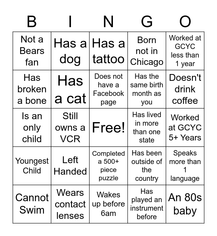 This bingo card has a free space and 24 words: Left Handed, Wears contact lenses, Does not have a Facebook page, Cannot Swim, Worked at GCYC less than 1 year, Not a Bears fan, Has broken a bone, Has a dog, Has lived in more than one state, Completed a 500+ piece puzzle, Has the same birth month as you, Is an only child, Has been outside of the country, Speaks more than 1 language, Has a cat, Has played an instrument before, Worked at GCYC 5+ Years, Has a tattoo, Doesn't drink coffee, Still owns a VCR, An 80s baby, Youngest Child, Born not in Chicago and Wakes up before 6am.