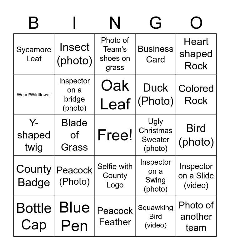 This bingo card has a free space and 25 words: Peacock (Photo), Peacock Feather, Oak Leaf, Bottle Cap, Heart shaped Rock, Sycamore Leaf, Weed/Wildflower, Insect (photo), Ugly Christmas Sweater (photo), Selfie with County Logo, Duck (Photo), Y-shaped twig, Inspector on a Swing (photo), Inspector on a Slide (video), Inspector on a bridge (photo), Selfie with an Ag Commissioner, Bird (photo), Photo of Team's shoes on grass, Colored Rock, Blade of Grass, Photo of another team, Blue Pen, County Badge, Business Card and Squawking Bird (video).