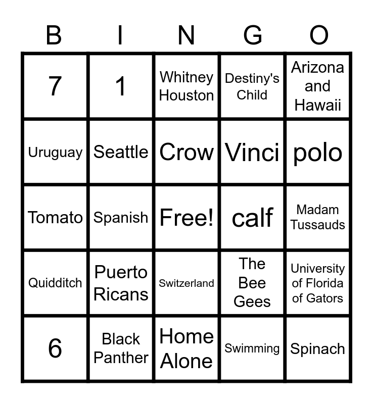 This bingo card has a free space and 32 words: Swimming, Greenland, Spanish, Adam Sandler, Quidditch, Seattle, Arizona and Hawaii, University of Florida of Gators, 1, Names, Crow, Whitney Houston, Gamma, Boxing Day, calf, Boston Celtics, 6, Tomato, Switzerland, Puerto Ricans, The Bee Gees, Dragonfly, Madam Tussauds, Black Panther, Spinach, Destiny's Child, Vinci, Uruguay, 7, Home Alone, Tennis and polo.