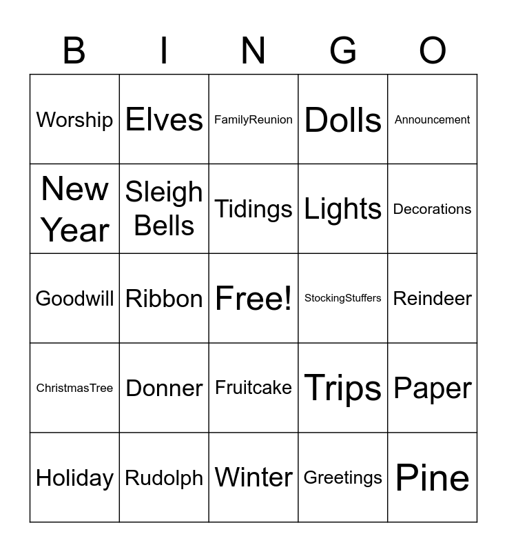 This bingo card has a free space and 102 words: Advent, Angels, Announcement, Bells, Bethlehem, Blitzen, Candles, Candy, CandyCanes, Cards, Cedar, Celebrate, Ceremonies, Chimney, Christmas, Cookies, ChristmasTree, Cold, Comet, CranberrySauce, Crowds, Cupid, Dancer, Dasher, December, Decorations, Dolls, Donner, Dressing, Eggnog, Elves, FamilyReunion, Festival, Fir, Frosty, Fruitcake, Gift Boxes, Gifts, Goodwill, Greetings, Ham, Happy, Holiday, Holly, Holy, Icicles, Jolly, Lights, Lists, Merry, Miracle, Mistletoe, New Year, Noel, North Pole, Pageant, Parades, Party, Pie, Pine, PlumPudding, Poinsettia, Prancer, Presents, PumpkinPie, Punch, Red/Green, Reindeer, Ribbon, Rudolph, Sacred, Sales, Sauce, Scrooge, Season, Sled, Sleigh Bells, Snowflakes, Spirit, St. Nick, Stand, Star, Stickers, StockingStuffers, SweetPotato, Tidings, Tinsel, Togetherness, Toys, Tradition, Traffic, Trips, Turkey, Vacation, Vixen, Winter, Worship, Wrapping, Paper, Wreath, Yule and Yuletide.