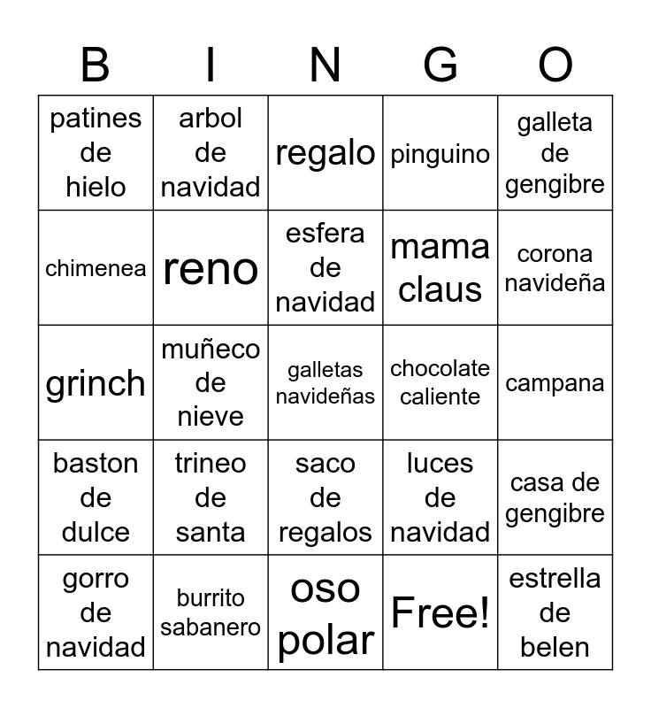 This bingo card has 32 words: Free!, santa, muñeco de nieve, bola de nieve, baston de dulce, reno, galleta de gengibre, casa de gengibre, arbol de navidad, estrella de belen, esfera de navidad, regalo, duende de navidad, bota de dulces, chocolate caliente, pascua, gorro de navidad, grinch, saco de regalos, trineo de santa, luces de navidad, pavo, campana, burrito sabanero, galletas navideñas, pinguino, mama claus, chimenea, patines de hielo, oso polar, sueter navideño and corona navideña.