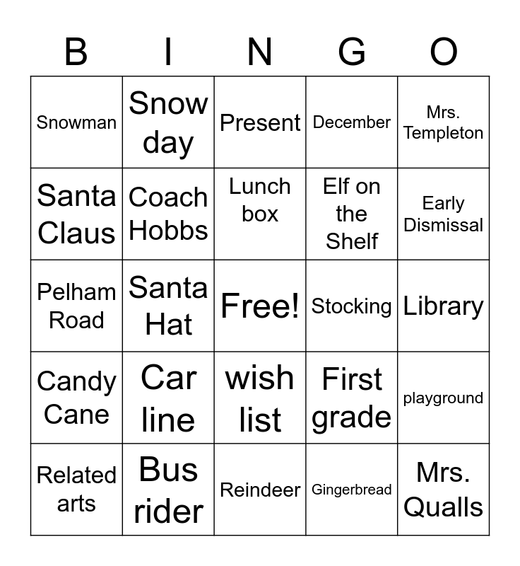 This bingo card has a free space and 24 words: Car line, Bus rider, Lunch box, Related arts, Mrs. Templeton, Snowman, Santa Claus, Snow day, Stocking, wish list, Elf on the Shelf, Pelham Road, First grade, playground, Coach Hobbs, Gingerbread, Library, Present, Early Dismissal, Santa Hat, Mrs. Qualls, Candy Cane, December and Reindeer.