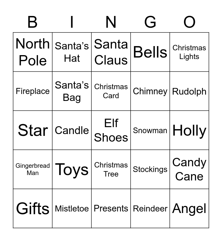 This bingo card has 37 words: Free!, Ornaments, Elf, Santa’s Bag, Candy Cane, Toys, Christmas Card, Christmas Cracker, Christmas Lights, Tinsel, Candle, Bells, Elf Shoes, Holly, Fireplace, Gingerbread Man, Gingerbread House, Santa Claus, Christmas Tree, Snowman, North Pole, Rudolph, Gifts, Presents, Christmas Carols, Reindeer, Santa’s Hat, Sleigh, Bow, Wrapping Paper, Wreath, Mistletoe, Star, Angel, Stockings, Chimney and Cookies & Milk.