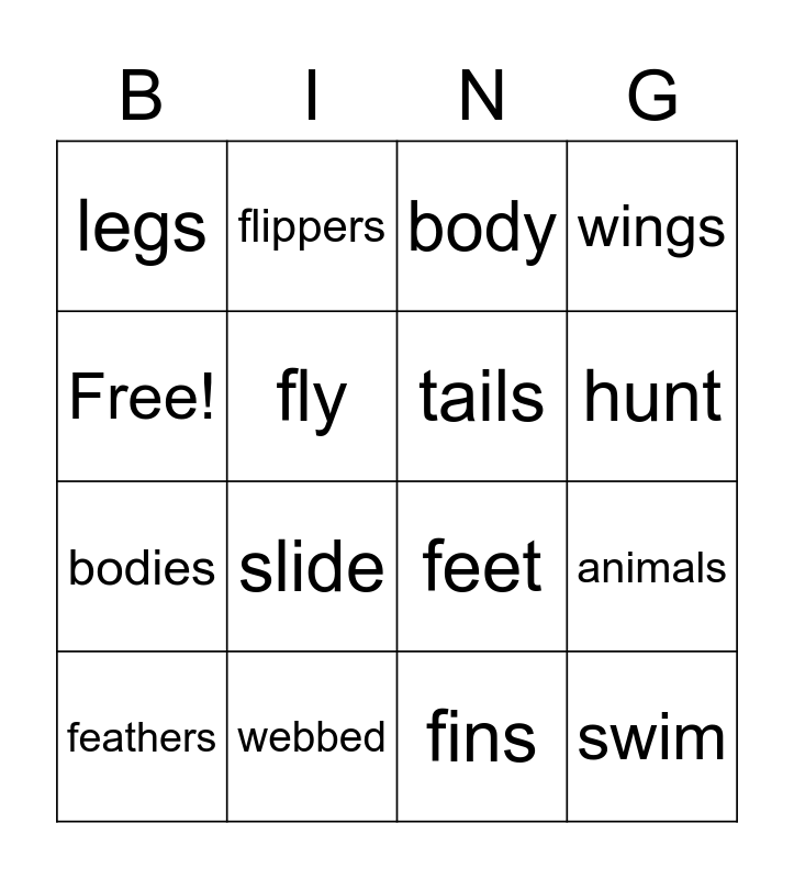 This bingo card has 16 words: webbed, animals, body, legs, bodies, flippers, feet, fins, Free!, fly, feathers, wings, slide, hunt, tails and swim.