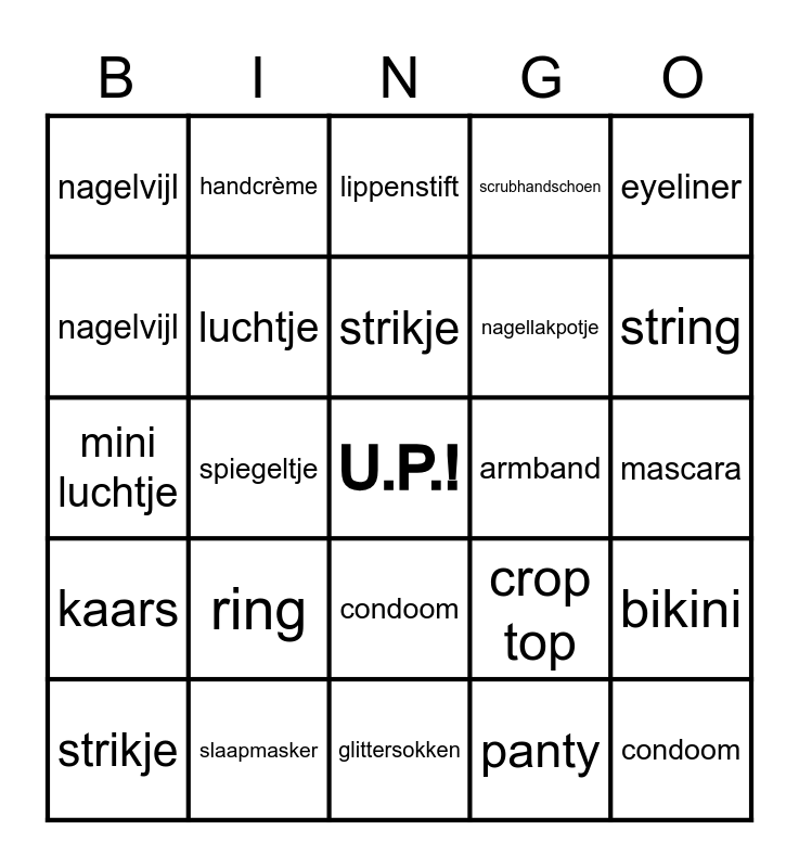⚠ This card has duplicate items: string (2), nagellakpotje (2), lippenstift (2), bh (2), mascara (2), panty (2), scrunchie (2), hakken (2), glijmiddel (2), tampon (2), maandverband (2), boobtape (2), strikje (2), nagelvijl (2), deodorant (2), spiegeltje (2), zonnebril (2), condoom (2), kauwgom (2), eyeliner (2), foundation (2), mini luchtje (2), luchtje (2), handcrème (2), scrubhandschoen (2), Australian Gold (2), ring (2), oorbellen (2), haarklem (2), oogschaduw (2), kwastje (2), ketting (2), armband (2), crop top (2)