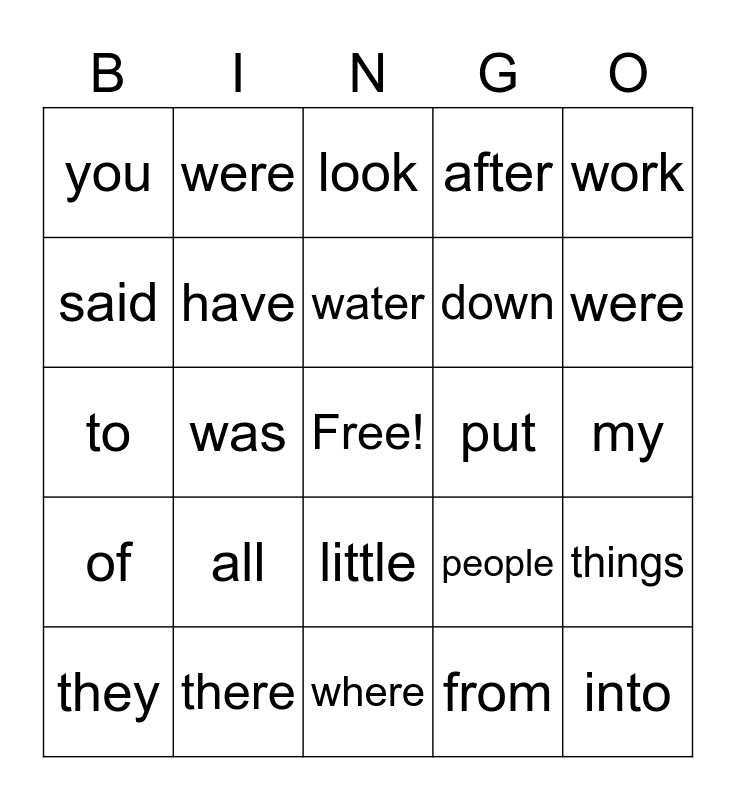 This bingo card has a free space and 24 words: all, there, water, they, work, you, said, were, put, little, down, to, people, things, have, from, my, look, were, was, into, of, after and where.