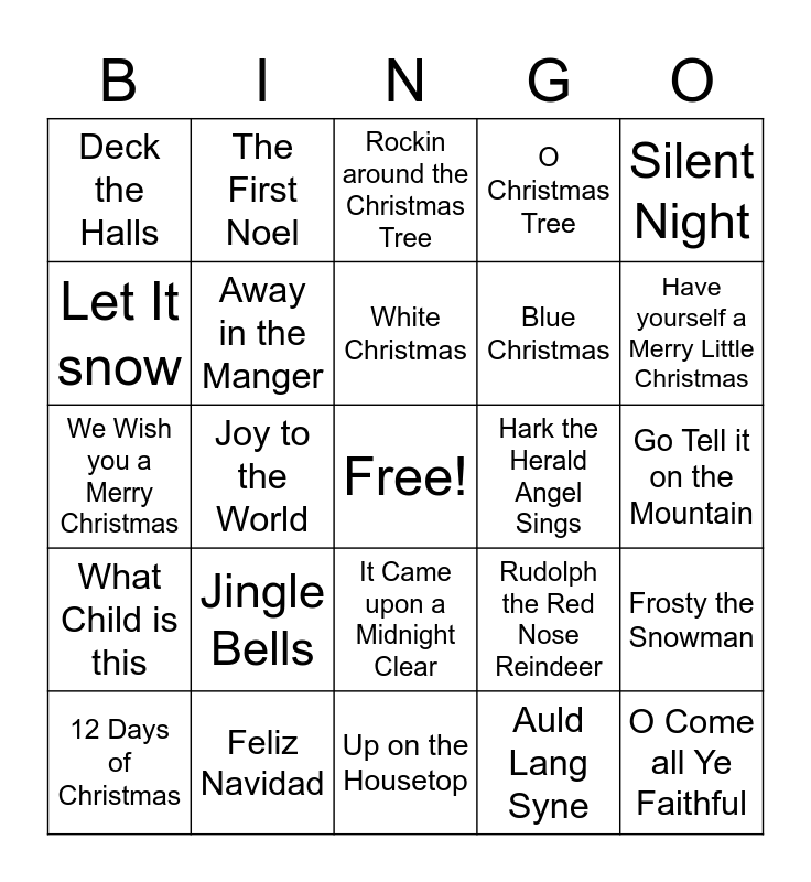 This bingo card has a free space and 24 words: Jingle Bells, Feliz Navidad, White Christmas, 12 Days of Christmas, Silent Night, Deck the Halls, Let It snow, The First Noel, Hark the Herald Angel Sings, It Came upon a Midnight Clear, Blue Christmas, We Wish you a Merry Christmas, Rudolph the Red Nose Reindeer, Frosty the Snowman, Away in the Manger, Auld Lang Syne, Go Tell it on the Mountain, Rockin around the Christmas Tree, Have yourself a Merry Little Christmas, Joy to the World, O Come all Ye Faithful, What Child is this, O Christmas Tree and Up on the Housetop.