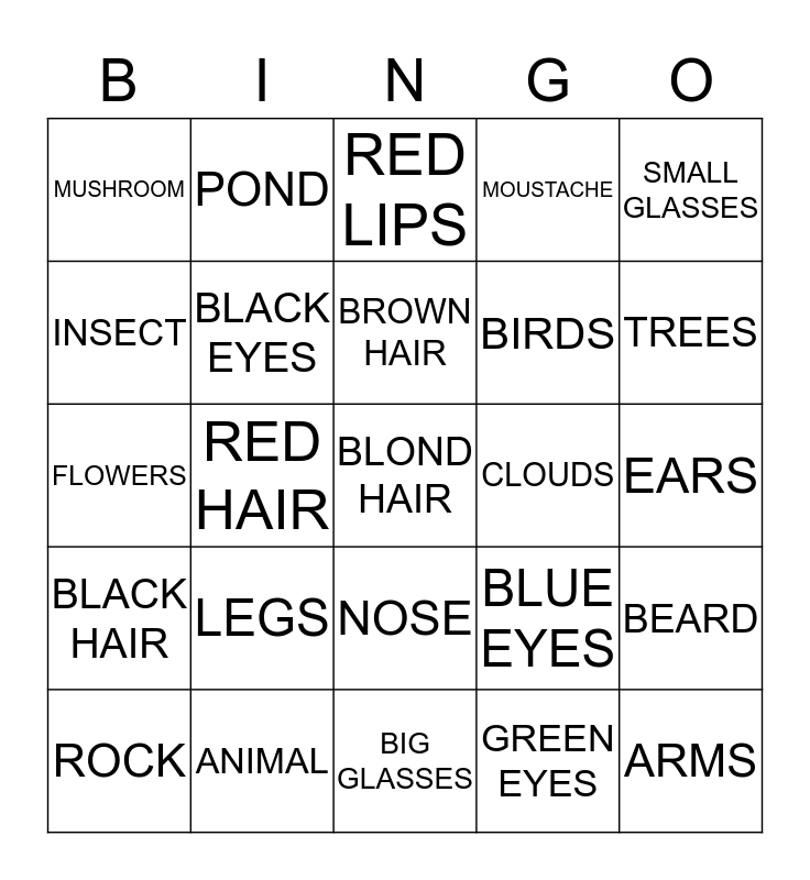 This bingo card has 25 words: LEGS, BIG GLASSES, BROWN HAIR, ROCK, SMALL GLASSES, MUSHROOM, INSECT, POND, CLOUDS, NOSE, BIRDS, FLOWERS, BLUE EYES, BEARD, BLACK EYES, ARMS, EARS, RED LIPS, TREES, RED HAIR, BLOND HAIR, ANIMAL, BLACK HAIR, MOUSTACHE and GREEN EYES.
