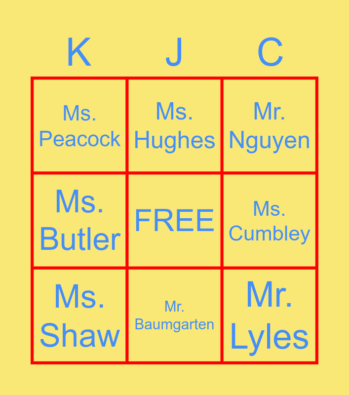 This bingo card has a free space and 11 words: Ms. Jones, Mr. Baumgarten, Mr. Lyles, Ms. Shaw, Ms. Hughes, Mr. Nguyen, Ms. Cumbley, Ms. Pam, Ms. Butler, Ms. Peacock and Mr. Sattiewhite.