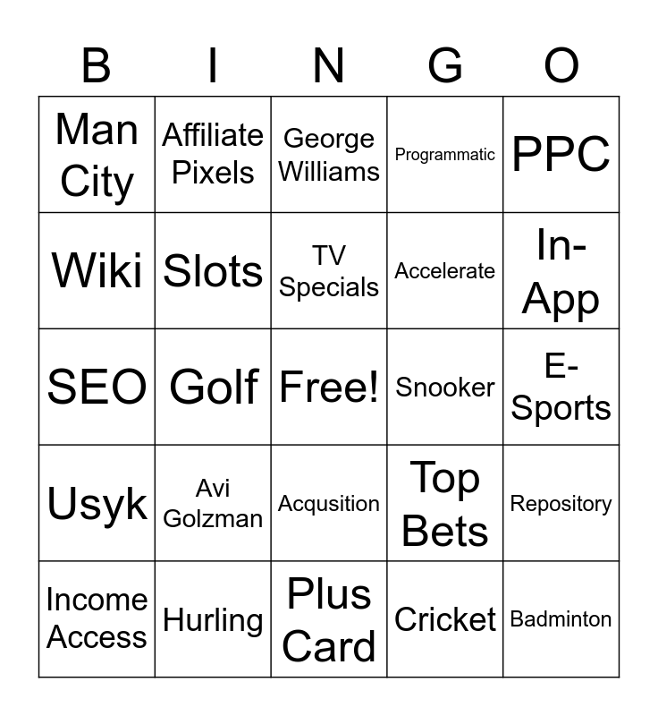 This bingo card has a free space and 102 words: Clicks, CPA, PPC, Paid Social, Tracking Link, UNO, Display, Google Ads, Marketing Operations, Landing Page, Enhanced Odds, H30, M50, NUI, Promo Code, AJ, Usyk, Football, Festive Value, Acca Value, Slack, HTML, User Journey Test, William Hill, Affiliates, In-App, Programmatic, Avi Golzman, Openbet, Customer Transfer, Affiliate Pixels, George Williams, Darren Newmark, Juanita Alzate, Banners, Acqusition, Hubspot, Invoice, SEO, Cricket, Michael Holdings, P2P, Income Access, Sales, Reports, Outlook, Domain, Accelerate, Timesheet, Jira, Yammer, Teams, Wiki, Odds, Bet, Horses, Acca, SOTD, American Football, Badminton, Baseball, Basketball, Cash-in, Withdrawal, Boxing, Darts, Cycling, E-Sports, Golf, Hurling, Greyhounds, Handball, Horse Racing, Casino, Vegas, Bingo, Slots, Ice Hockey, Olympics, Lottery, Motorbikes, Politics, Rugby League, Snooker, Table Tennis, TV Specials, UFC, Virtual World, Volleyball, Water Polo, Sailing, Top Bets, Results, WH Radio, Poker, Plus Card, Man City, Man United, Repository, Jackpots, Live Casino and Roulette.