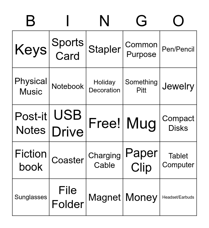 This bingo card has a free space and 32 words: Money, Kleenex, USB Drive, Non-fiction book, Fiction book, Notebook, Pen/Pencil, Tablet Computer, Sports Card, Toy Figure, Holiday Decoration, Stapler, Three Hole Punch, Envelope, Mug, Gum/Mints, Sunglasses, Post-it Notes, Charging Cable, Coaster, Paper Clip, Rubber Band, Compact Disks, File Folder, Headset/Earbuds, Common Purpose, Something Pitt, Physical Music, Keys, Magnet, Lego Brick and Jewelry.