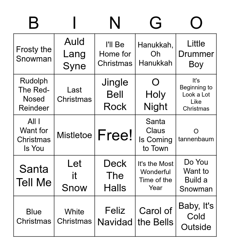 This bingo card has a free space and 24 words: Let it Snow, White Christmas, Jingle Bell Rock, Blue Christmas, Little Drummer Boy, Frosty the Snowman, Rudolph The Red-Nosed Reindeer, Auld Lang Syne, Santa Claus Is Coming to Town, Deck The Halls, O Holy Night, All I Want for Christmas Is You, It's the Most Wonderful Time of the Year, Do You Want to Build a Snowman, Last Christmas, Carol of the Bells, O tannenbaum, I'll Be Home for Christmas, It's Beginning to Look a Lot Like Christmas, Mistletoe, Baby, It's Cold Outside, Santa Tell Me, Hanukkah, Oh Hanukkah and Feliz Navidad.