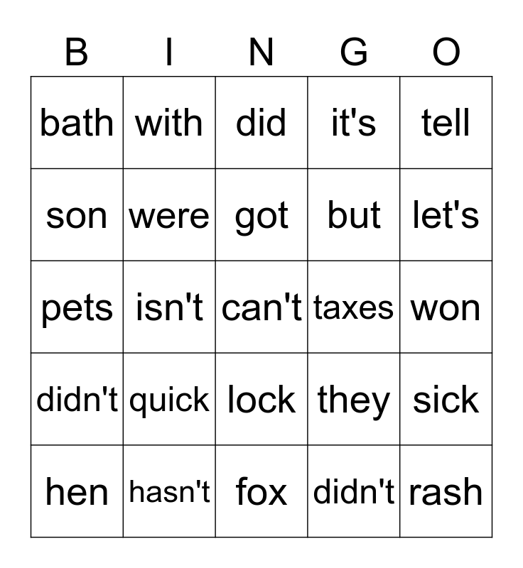 This bingo card has 25 words: quick, fox, got, hen, tell, bath, son, with, taxes, lock, but, pets, they, sick, were, rash, won, did, let's, isn't, can't, hasn't, didn't, it's and didn't.