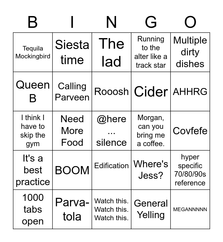 This bingo card has a free space and 24 words: BOOM, Parva-tola, Rooosh, 1000 tabs open, Multiple dirty dishes, Tequila Mockingbird, Queen B, Siesta time, Morgan, can you bring me a coffee., Edification, Cider, I think I have to skip the gym, Where's Jess?, hyper specific 70/80/90s reference, Calling Parveen, General Yelling, Covfefe, The lad, AHHRG, Need More Food, MEGANNNNN, It's a best practice, Running to the alter like a track star and Watch this. Watch this. Watch this..