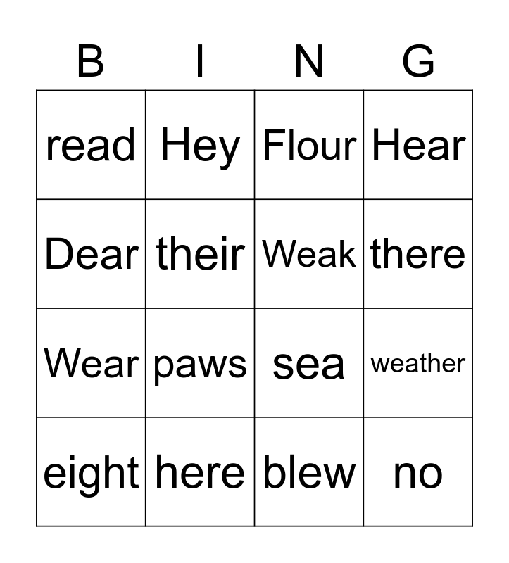 This bingo card has 43 words: Ate, eight, Bear, bare, Bury, berry, Flour, flower, Dear, deer, Hear, here, Aunt, ant, Tale, tail, See, sea, Pause, paws, Hey, hay, Red, read, Blue, blew, Flu, flew, Know, no, Whole, hole, Wether, weather, You’re, your, They’re, there, their, Wear, where, Weak and week.