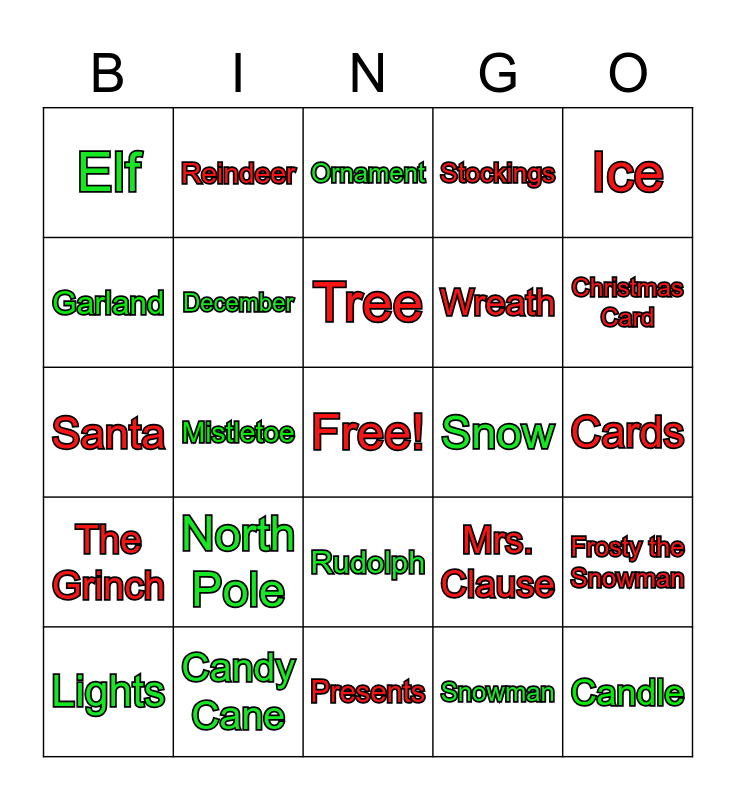 This bingo card has a free space and 34 words: Winter, Snowman, Sleigh, Hot Cocoa, The Grinch, December, Ice, Lights, Reindeer, Christmas, Tree, Ornament, Cookies, Jingle Bells, Snow, Christmas Card, Candy Cane, Santa, North Pole, Mrs. Clause, Rudolph, Cold, Elf, Cards, Presents, Candle, Stockings, Toys, Wreath, Garland, Holly, Mistletoe, Frosty the Snowman and Jack Frost.
