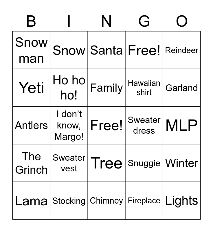 This bingo card has a free space and 29 words: Lama, FS Partnerships, I don’t know, Margo!, Suit & tie, Snow man, Santa, Ho ho ho!, Sweater vest, Sweater dress, Stocking, MLP, Lights, Chimney, Fireplace, Garland, Deer, Tree, The Grinch, Reindeer, Antlers, Snuggie, Pajamas, Hawaiian shirt, Yeti, Free!, Snow, Winter, Family and Friends.