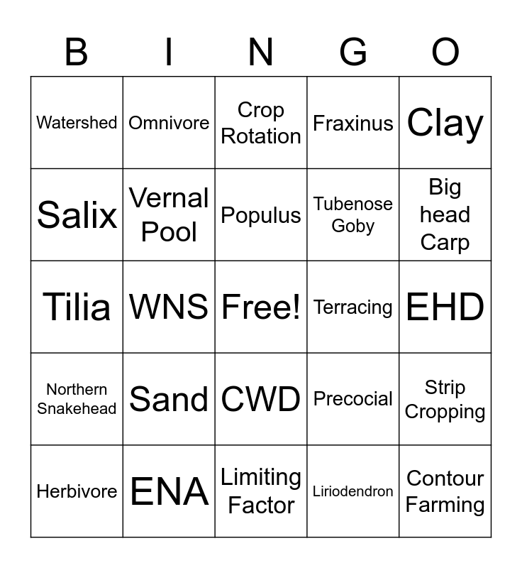 This bingo card has a free space and 24 words: Sand, ENA, Populus, Herbivore, Clay, Watershed, Salix, Omnivore, Terracing, CWD, Tubenose Goby, Tilia, Precocial, Strip Cropping, Vernal Pool, Liriodendron, EHD, Crop Rotation, Big head Carp, WNS, Contour Farming, Northern Snakehead, Fraxinus and Limiting Factor.