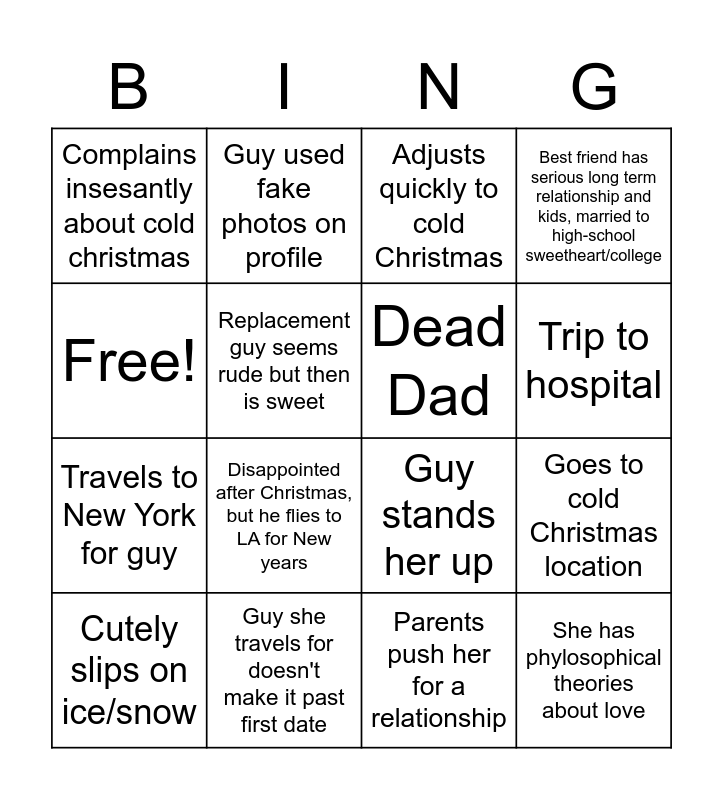 This bingo card has 16 words: Guy she travels for doesn't make it past first date, Goes to cold Christmas location, Adjusts quickly to cold Christmas, Complains insesantly about cold christmas, Travels to New York for guy, Guy used fake photos on profile, Guy stands her up, Parents push her for a relationship, Free!, Replacement guy seems rude but then is sweet, Cutely slips on ice/snow, Best friend has serious long term relationship and kids, married to high-school sweetheart/college, Disappointed after Christmas, but he flies to LA for New years, Trip to hospital, Dead Dad and She has phylosophical theories about love.