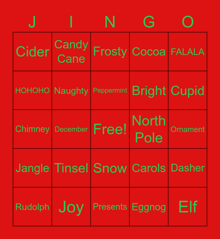 This bingo card has a free space and 61 words: Jolly, Joy, Jingle, Jangle, Eggnog, Peace, Naughty, Nice, Bright, Holly, Cocoa, Mrs. Claus, HOHOHO, Milk, Cookies, Cider, Elf, FALALA, Believe, Peppermint, North Pole, Frosty, Rudolph, Dasher, Dancer, Prancer, Vixen, Comet, Cupid, Donner, Blitzen, Wish, Silver, Gold, Candy Cane, Grinch, Scrooge, December, Mistletoe, Chimney, Silent Night, Tinsel, Ornament, Winter, Carols, Party, Family, Santa, Candle, Snow, Presents, Sleigh, Cozy, Angels, Cards, Twinkle, Stocking, Snow Globe, Wreath, Bells and Toys.