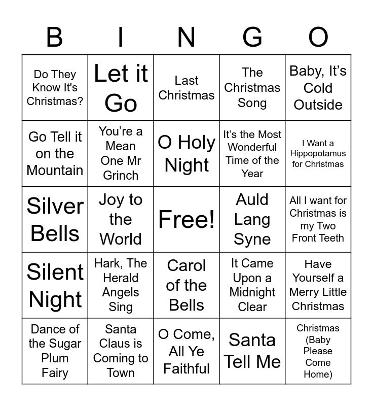 This bingo card has a free space and 52 words: Come Thou Fount of Every Blessing, Christmas (Baby Please Come Home), Mistletoe, O Come, All Ye Faithful, Hark, The Herald Angels Sing, That’s Christmas to Me, Let it Go, Mary, Did you Know?, Go Tell it on the Mountain, All I Want for Christmas is You, You’re a Mean One Mr Grinch, Jingle Bells, Have Yourself a Merry Little Christmas, It Came Upon a Midnight Clear, Wintersong, In The Bleak MidWinter, O Holy Night, Auld Lang Syne, God Rest Ye Merry Gentlemen, Baby, It’s Cold Outside, Joy to the World, Santa Tell Me, Do They Know It's Christmas?, It’s the Most Wonderful Time of the Year, Christmas in Hollis, Rocking Around the Christmas Tree, Sleigh Ride, Happy Xmas (War is Over), I Want a Hippopotamus for Christmas, White Christmas, I’ll Be Home For Christmas, The Christmas Song, Frosty The Snow Man, Blue Christmas, Wonderful Christmas Time, Last Christmas, Santa Claus is Coming to Town, Merry Christmas, Happy Holidays, Its Beginning to Look a lot like Christmas, Deck the Halls, I Saw Mommy Kissing Santa Claus, All I want for Christmas is my Two Front Teeth, Silent Night, The First Noel, Carol of the Bells, Little Drummer Boy, O Little Town of Bethlehem, Silver Bells, Mele Kalikimaka, Christmas in Killarney, Dance of the Sugar Plum Fairy and Angels We Have Heard on High.