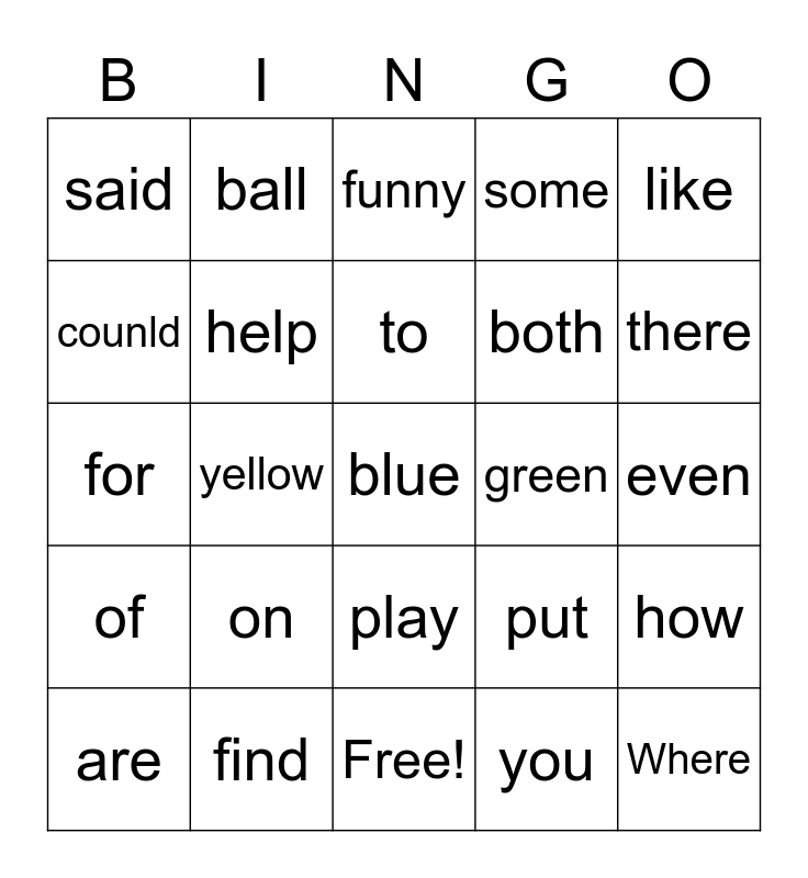 This bingo card has 27 words: are, the, to, you, like, said, ball, blue, both, even, for, help, Free!, put, there, why, yellow, counld, find, funny, green, how, of, on, play, some and Where.