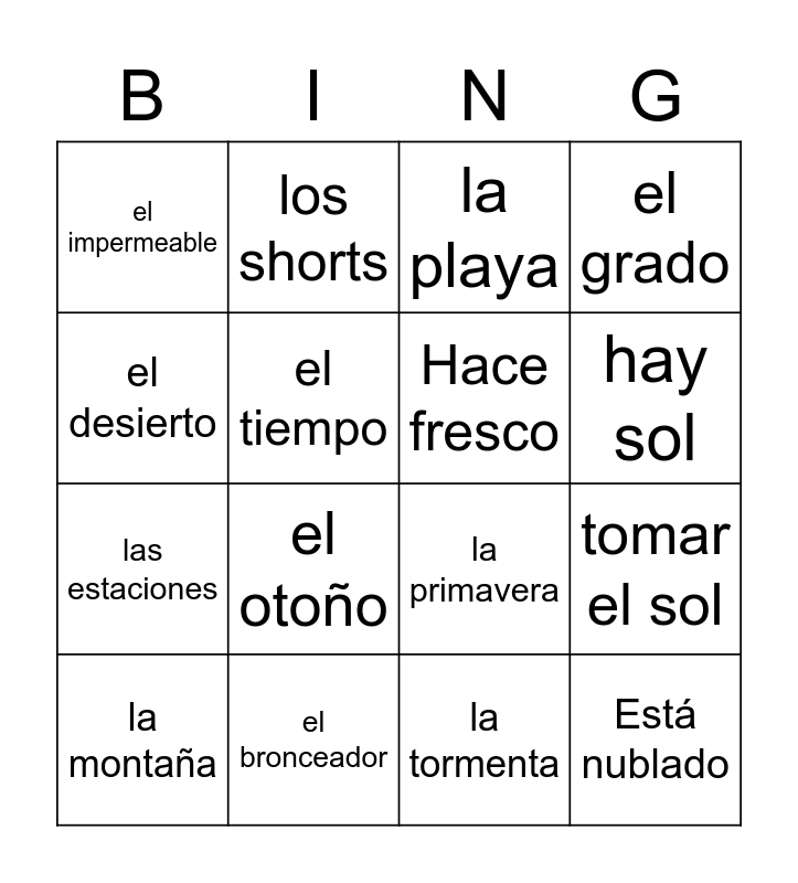 es la hora de bingo el línea | Spanish Words Bingo | Spanish Bingo | weather | Describir el tiempo.