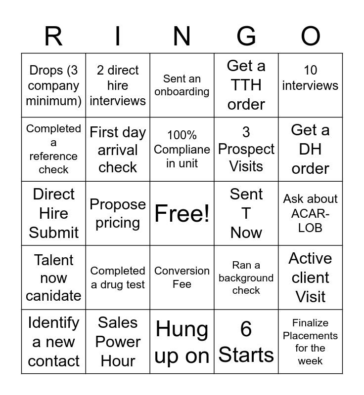 This bingo card has a free space and 24 words: Completed a drug test, Sales Power Hour, 100% Compliane in unit, Identify a new contact, 10 interviews, Drops (3 company minimum), Completed a reference check, 2 direct hire interviews, Sent T Now, Conversion Fee, 3 Prospect Visits, Direct Hire Submit, Ran a background check, Active client Visit, First day arrival check, 6 Starts, Ask about ACAR-LOB, Sent an onboarding, Get a DH order, Propose pricing, Finalize Placements for the week, Talent now canidate, Get a TTH order and Hung up on.